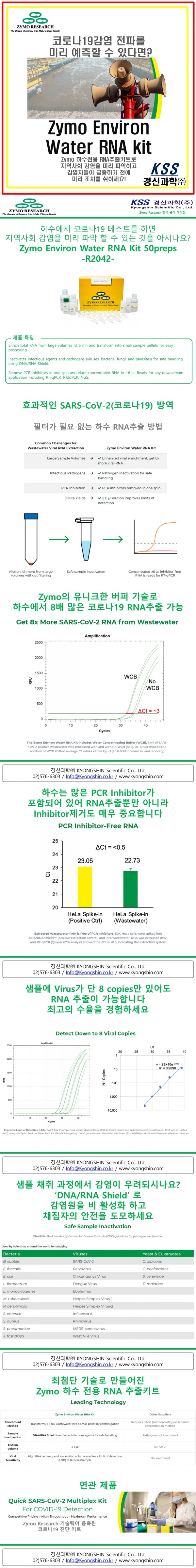 하수에서 코로나 바이러스 RNA를 추출해 검사하면 미리 감염 전파 양상을 알 수 있다는 것을 알고 계신가요? 하지만 하수에서 RNA 추출하는 것은 복잡하고 어려웠습니다. Zymo Research에서 새로 나온 Environ Water RNA prep kit 은 하수 샘플에서 극미량의 코로나 바이러스도 검출 가능한 전용 RNA추출 키트입니다. 병원, 학교등의 하수를 미리 체크하고 감염자 전파 양상을 확인할 수 있습니다. #경신과학#KSS #ZymoResearch #자이모리서치 #COVID19 #코로나19 #SARS2CoV #Environ #Water #RNA #KIT #핵산추출 #진단 #검진 #방역 #하수진단 #하수 #Filter_free