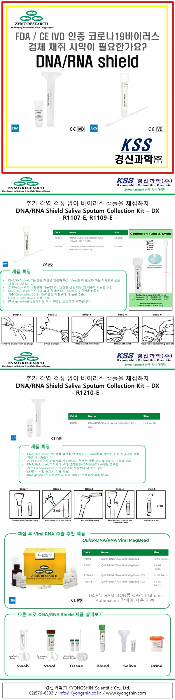 FDA / CE IVD 인증받은 검체 채취 시약을 소개합니다. Zymo Research의 DNA/RNA shield™은 핵산을 상온에서도 안정히 보존하는 시약입니다. 바이러스와 박테리아를 비 활성화 하는 성상도 있기 때문에 채집 상태를 온전히 보존하며 또한 채집 후 감염성도 없어 안전한 검사가 가능합니다. 모든 종류의 샘플에 사용 가능하고, 다양한 포맷의 채집용기도 준비되어 있습니다. 코로나19(SARS-CoV-2)외에도 각종 핵산 검사용 샘플에 사용해보세요! #경신과학 #KSS #ZymoResearch #COVID19 #FDA #CE #IVD #Preservation #DNARNAshield