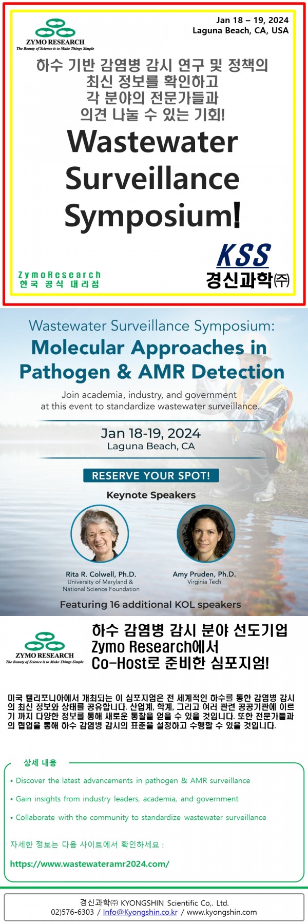 하수 감염병 감시 선도기업 Zymo Research에서 CoHost로 준비한 Wastewater Surveillance Symposium. 하수를 통한 감염병감시의 최근 동향과 정책들을 확인하고 전문가들과 의견을 나누세요! 미국 캘리포니아에서 1월 18~19, 이틀간 각 분야의 전문가 들과 함께 진행됩니다! 자세한 일정은 다음링크(https://www.wastewateramr2024.com/)를 확인하세요! 많은 자리가 남지 않았습니다!