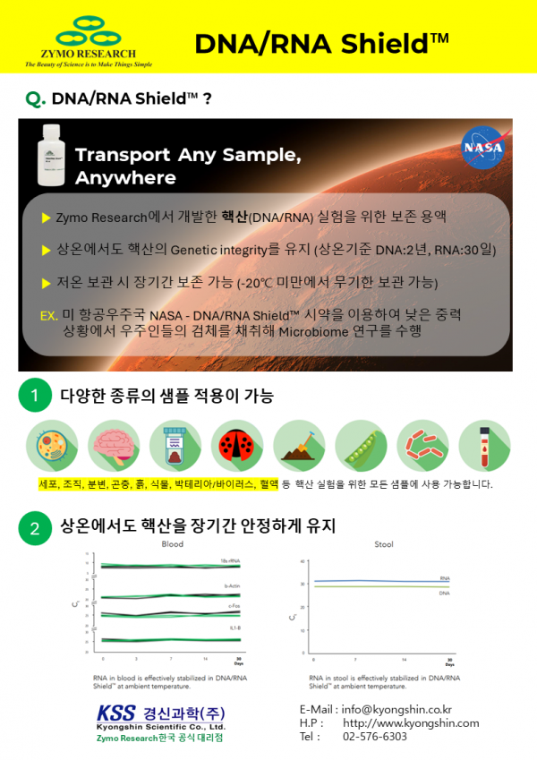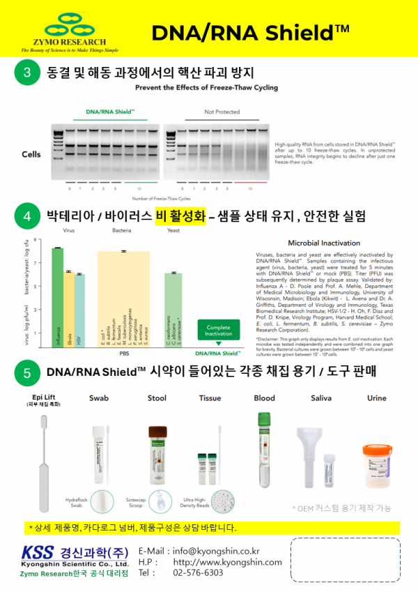 ZYMO] 핵산 보존 시약(DNA/RNA Shield) 및 용기 정보 페이지 정보 작성자 Kyongshin 작성일24-02-29 09:22 이전글 다음글 목록 본문 Zymo Research에서 개발한 핵산 보존 시약 DNA/RNA shield™ 테스트용 샘플 제공 가능! 이전글 다음글 목록