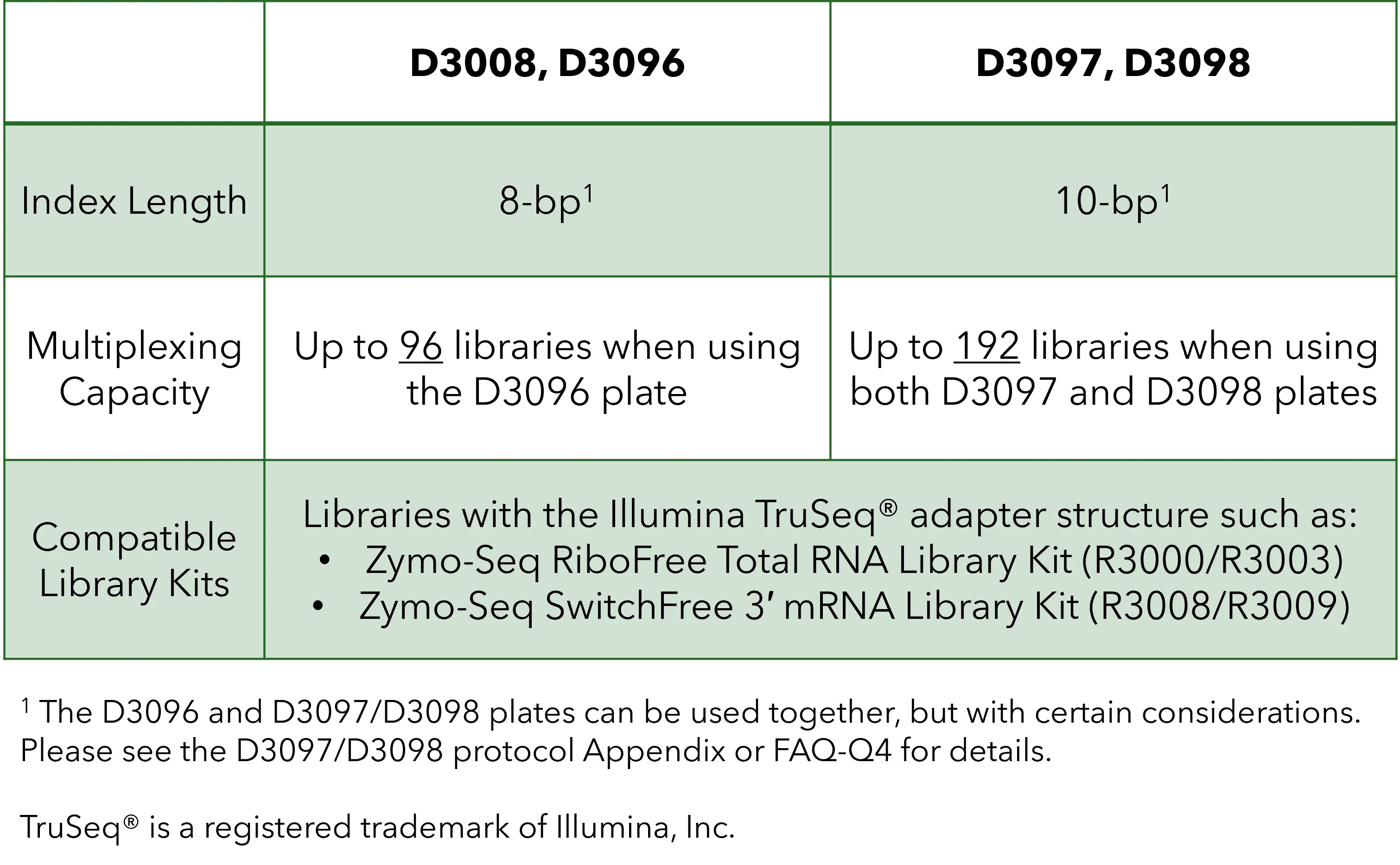 | D3096 | Zymo-Seq UDI Primer Plate (Indexes 1-96) | 96 Indexes | |