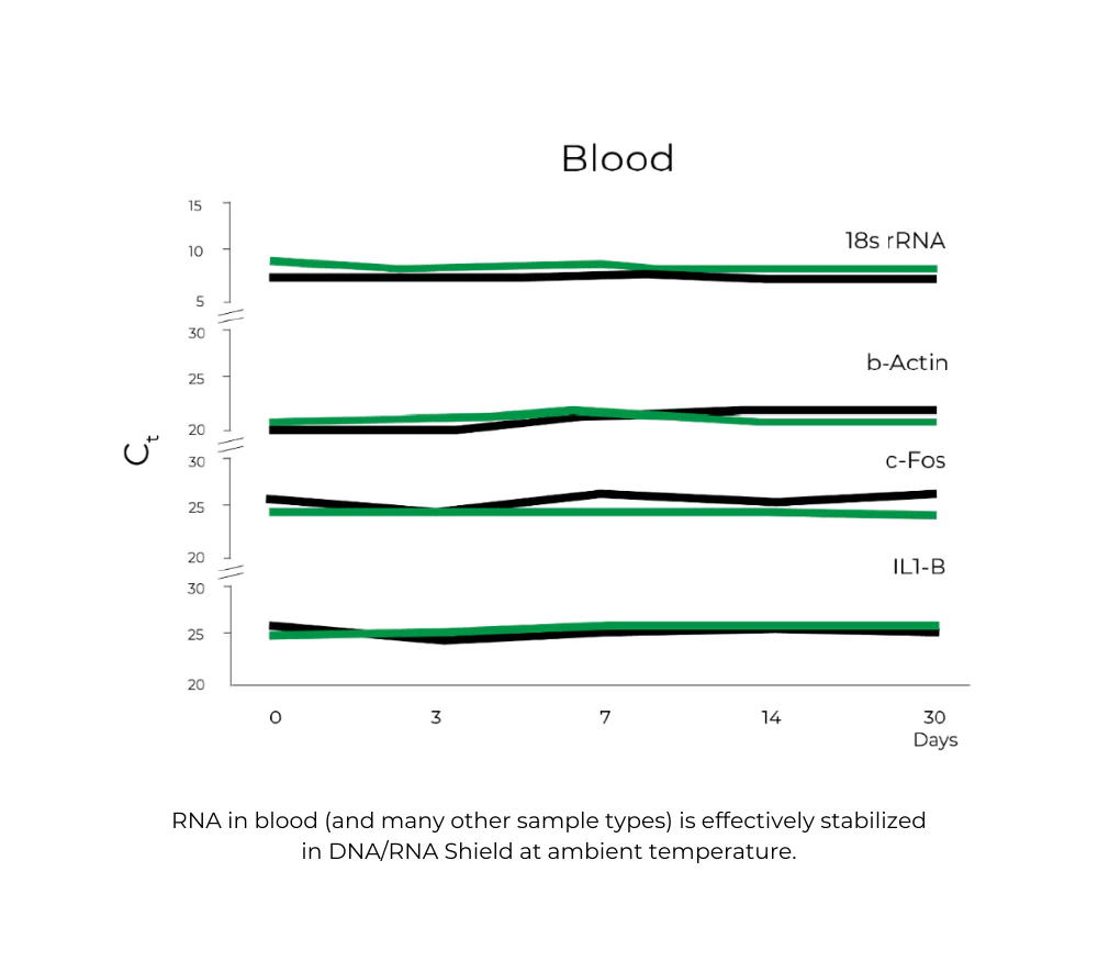 DNA/RNA Shield can be used on a wide variety of sample types including cells, tissues, biological fluids (plasma, serum, saliva, urine), and environmental samples (feces, plants, swabs, etc.).